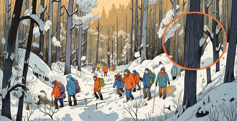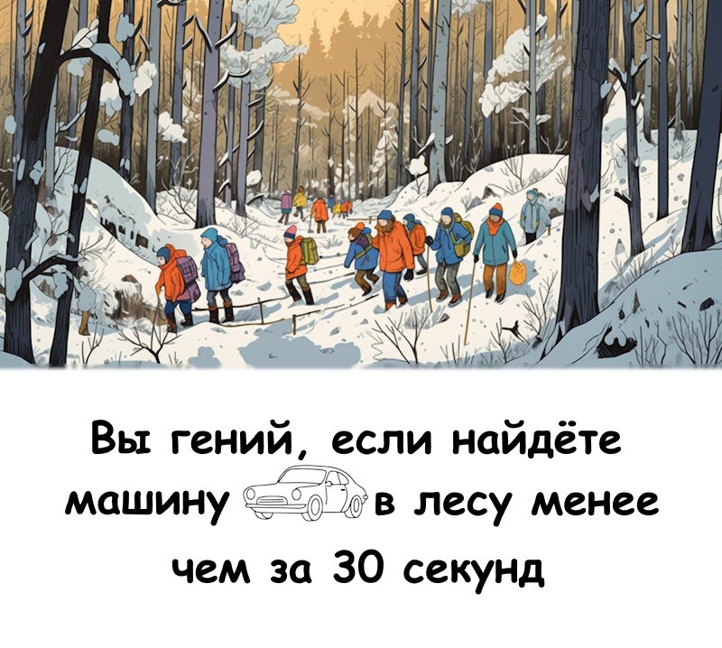 Вот только никто из них не замечает присутствия тут автомобиля. Где же он притаился? Только самые внимательные сразу увидят машину на картинке. Попробуйте разглядеть ее и вы. Если сможете обнаружить авто в лесу менее чем за полминуты — вы заслужили почетное звание «зоркий глаз».