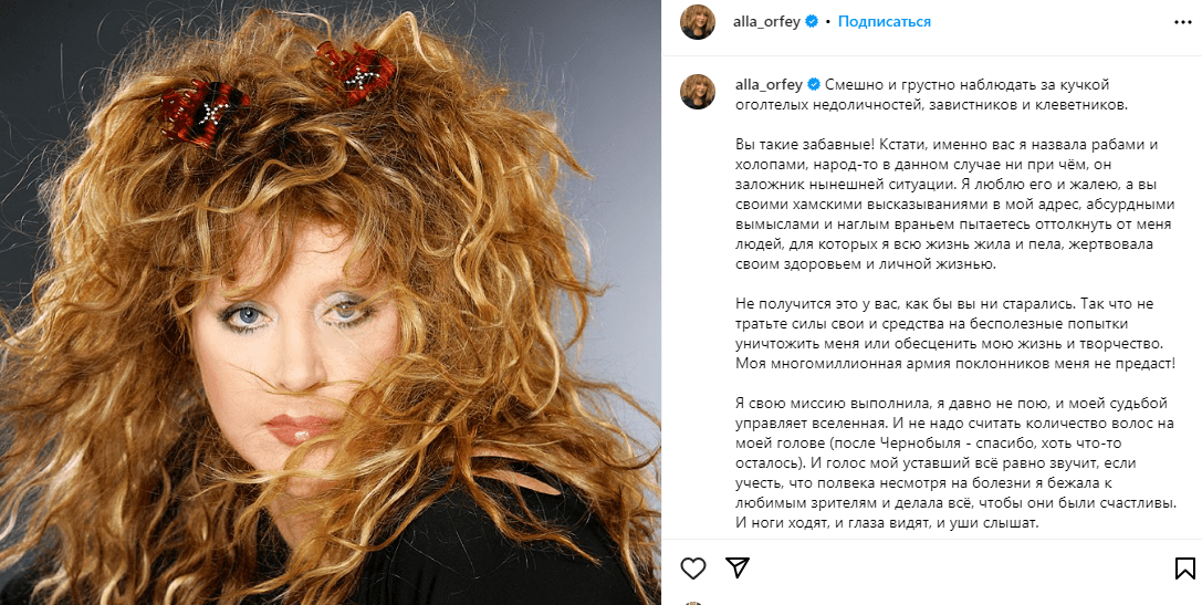 Алла Пугачева на фоне сплетен в Рф о ее возвращении на сцену впервые за долгое время сделала громкое заявление, в котором косвенно коснулась военной темы. Свой ответ «кучке оголтелых недоличностей, завистников и клеветников» примадонна опубликовала в Instagram. «Вы такие забавные! Кстати, именно вас я назвала рабами и холопами, народ-то в данном случае ни при чем, он заложник нынешней ситуации.
