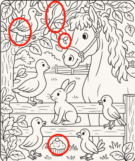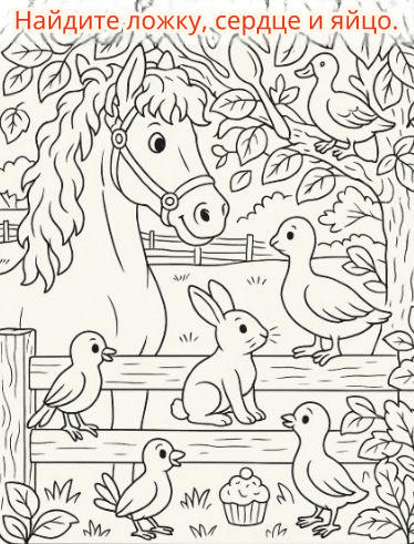 - Раскрашивание для Спокойствия: Заполнение гривы лошади, меха кролика и листвы на ветках может успокоить тревожные умы. Поощряйте детей (или себя!) придумывать узоры — птиц в горошек или капкейки-радуги.