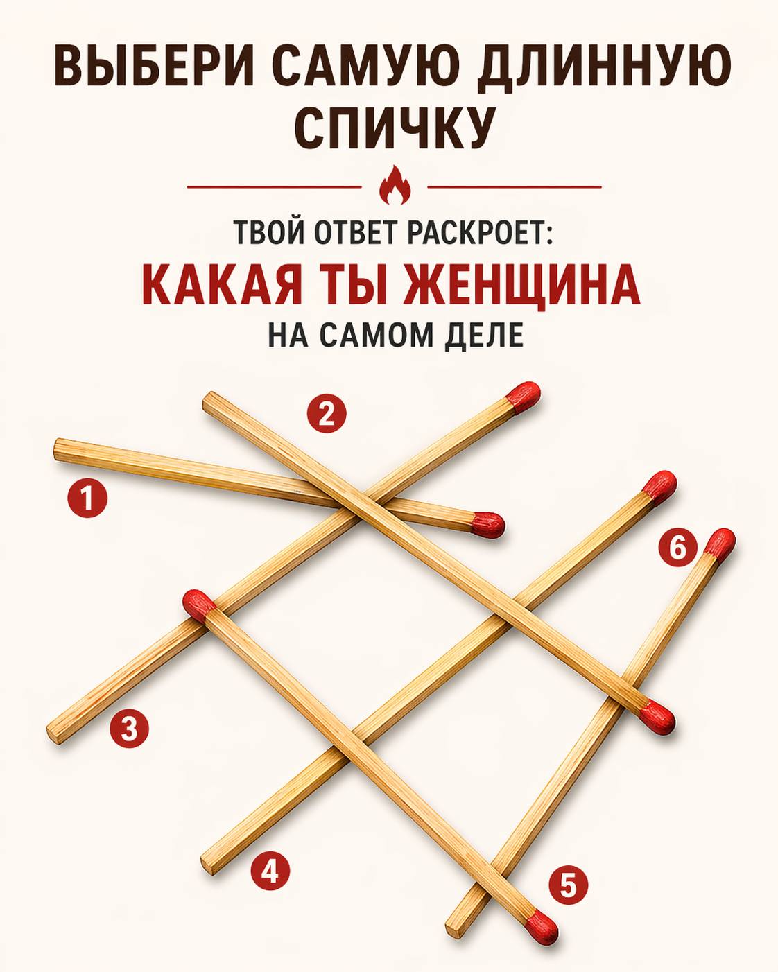 На первый взгляд это кажется обычной визуальной головоломкой — шесть разбросанных и частично наложенных друг на друга спичек, каждая из которых отмечена цифрой от 1 до 6. Задание простое: выбери самую длинную.