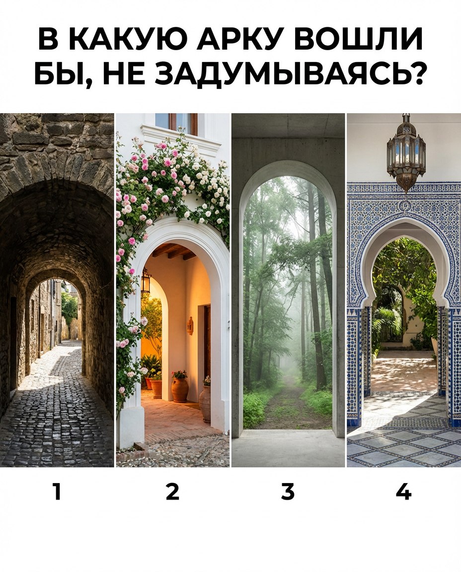 Такие визуальные задачи — отличный способ проверить свою внимательность и немного отвлечься от повседневной суеты. Иногда мы настолько привыкаем видеть мир однобоко, что забываем: за любой «дверью» скрывается бесконечное множество возможностей. Какая бы арка ни притянула ваш взгляд первой — серая старина, уютный дворик, туманный лес или восточная роскошь — это отражение того, что сейчас для вас наиболее ценно. А теперь, когда вы совершили свой выбор, самое время поделиться им с другими. Ведь всегда любопытно узнать, что именно привлекает окружающих: стремление к покою, желание домашнего уюта, жажда лесного уединения или тяга к экзотическим приключениям. Посмотрите в комментариях, совпадают ли ваши предпочтения с выбором других людей, или же вы оказались в меньшинстве? Возможно, именно ваш выбор окажется самым неожиданным и интересным для всех нас.