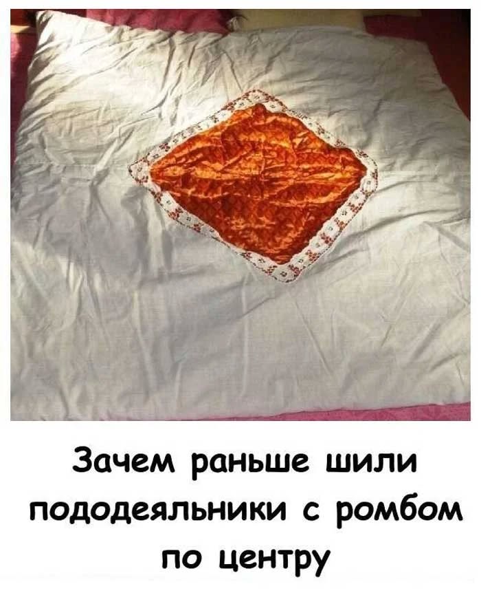 Советское прошлое оставило нам множество различных изделий, которые побуждают интерес к их изучению. Даже такая незначительная вещь, как обычный пододеяльник, может хранить в себе вопросы для самых любознательных людей. Ромбовидное отверстие в пододеяльнике было отличным функциональным решением. Оно позволяло не только по максимуму использовать полотна ткани, но и имело свои практические преимущества, обеспечивающие удобство эксплуатации и приятный эстетический вид.