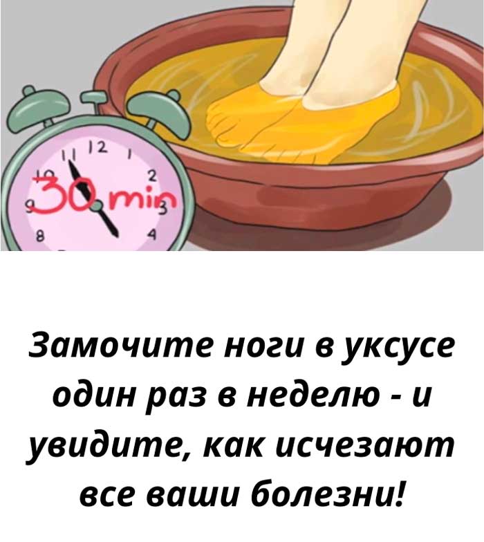 Смешайте в равных частях уксус и воду, подержите ноги в растворе около 45 минут,