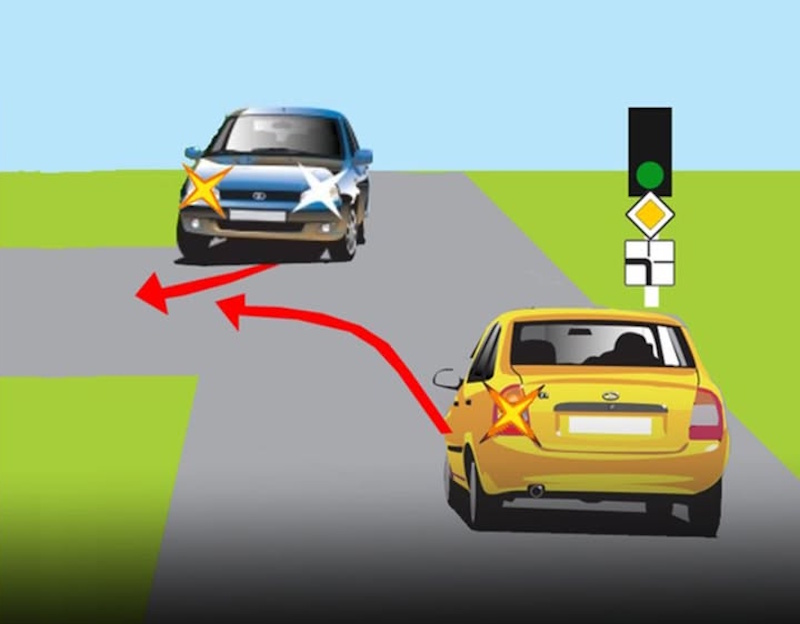 Две машины приближаются к регулируемому перекрестку на встречу друг другу. Желтый автомобиль собирается повернуть в левую сторону, а синий в правую. Возникает простой вопрос — а кто кому должен уступить, а у кого преимущество?