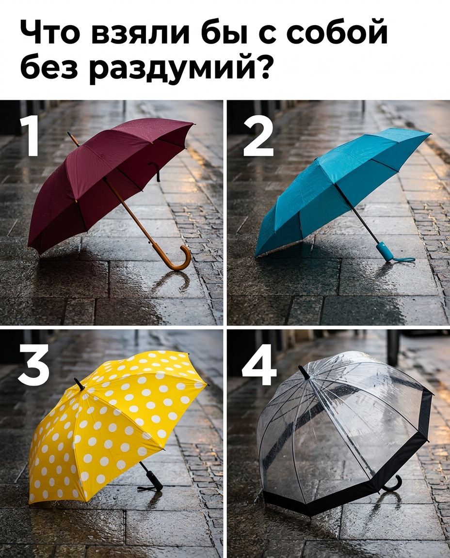 Предлагаем вам немного поразмышлять и честно ответить себе, почему именно этот вариант отозвался в сердце прямо сейчас. Поделитесь этим с близкими или друзьями, ведь обсуждение таких невинных визуальных тестов — это отличный способ узнать друг друга с новой, неожиданной стороны. Возможно, ваш выбор удивит даже вас самих, если вы решите пересмотреть его через пару часов. В этом и заключается прелесть подобных загадок: они позволяют нам на секунду остановиться, выдохнуть и просто улыбнуться дождливой погоде, ведь с правильным зонтом любая осень становится уютной. А что выбрали бы вы, если бы выход на улицу зависел только от вашего выбора аксессуара в эту самую минуту? Посмотрите еще раз, внимательно, до самых краев, и доверьтесь своей интуиции — она редко подводит в таких простых, но важных вещах.